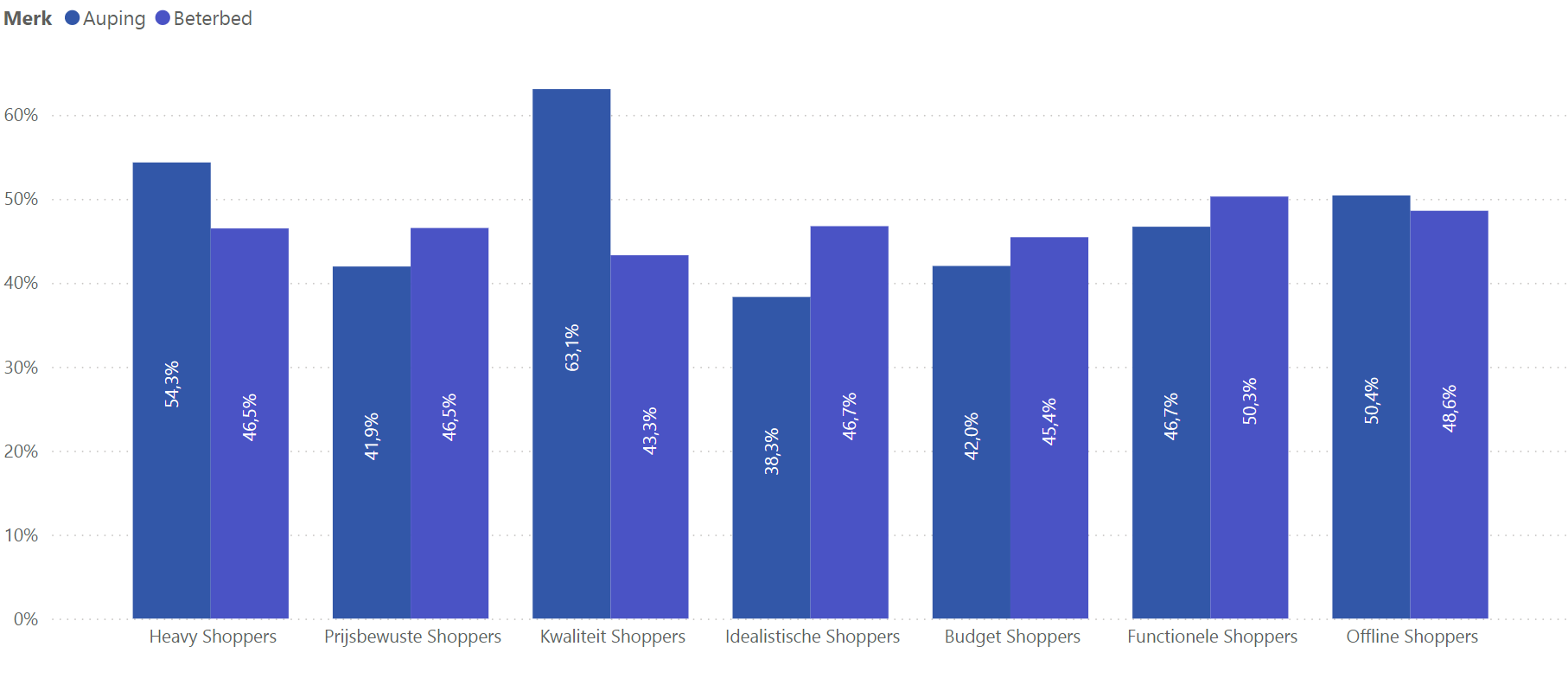 Het dashboard biedt de mogelijkheid om merken te vergelijken, waardoor jij kan beoordelen hoe jouw merk zich tot een ander merk verhoudt bij Shopping segmenten. Daardoor kun je per segment kijken welk merk de voorkeur heeft. Zo is voor diverse merken een vergelijking te maken. In de voorbeelden zie je vergelijkingen tussen achtereenvolgend woonwarenhuizen, beddenleveranciers en een vergelijking tussen een budgetmerk en A-merk.