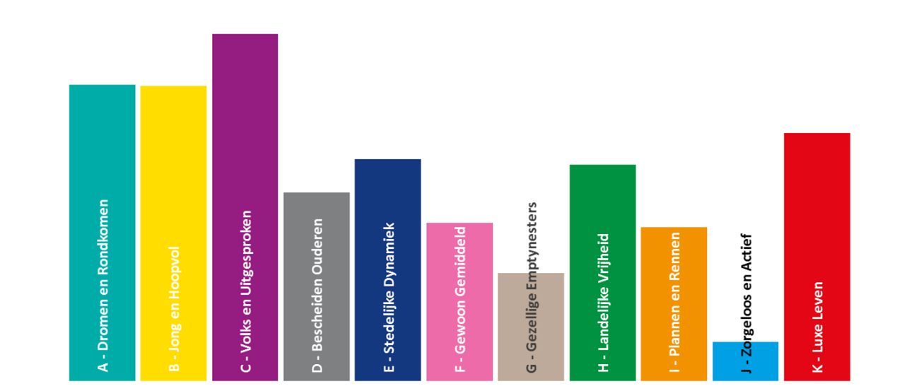 Voor het bepalen van de doelgroepen die tweedehands aankopen doen hebben we specifiek gekeken naar de aankoop van goederen voor in huis met een nieuwwaarde van minimaal 100 euro. Je ziet dan duidelijk dat de huurders segmenten en de segmenten met een beneden gemiddelde welstand vaker tweedehands aankopen voor in huis doen. Opvallend is dat ook het meest welstandige segment K –Luxe leven oververtegenwoordigd is, al zoekt deze doelgroep daarbij waarschijnlijk ook veel naar antiek. De empty nest-segmenten J - Zorgeloos en Actief en G – Gezellige Emptynesters kopen het minst tweedehands goederen voor in huis. De gezinssegementen F – Gewoon Gemiddeld en I – Plannen en Rennen die veel online aankopen doen (al dan niet rond Black Friday) scoren ook duidelijk onder het gemiddelde.